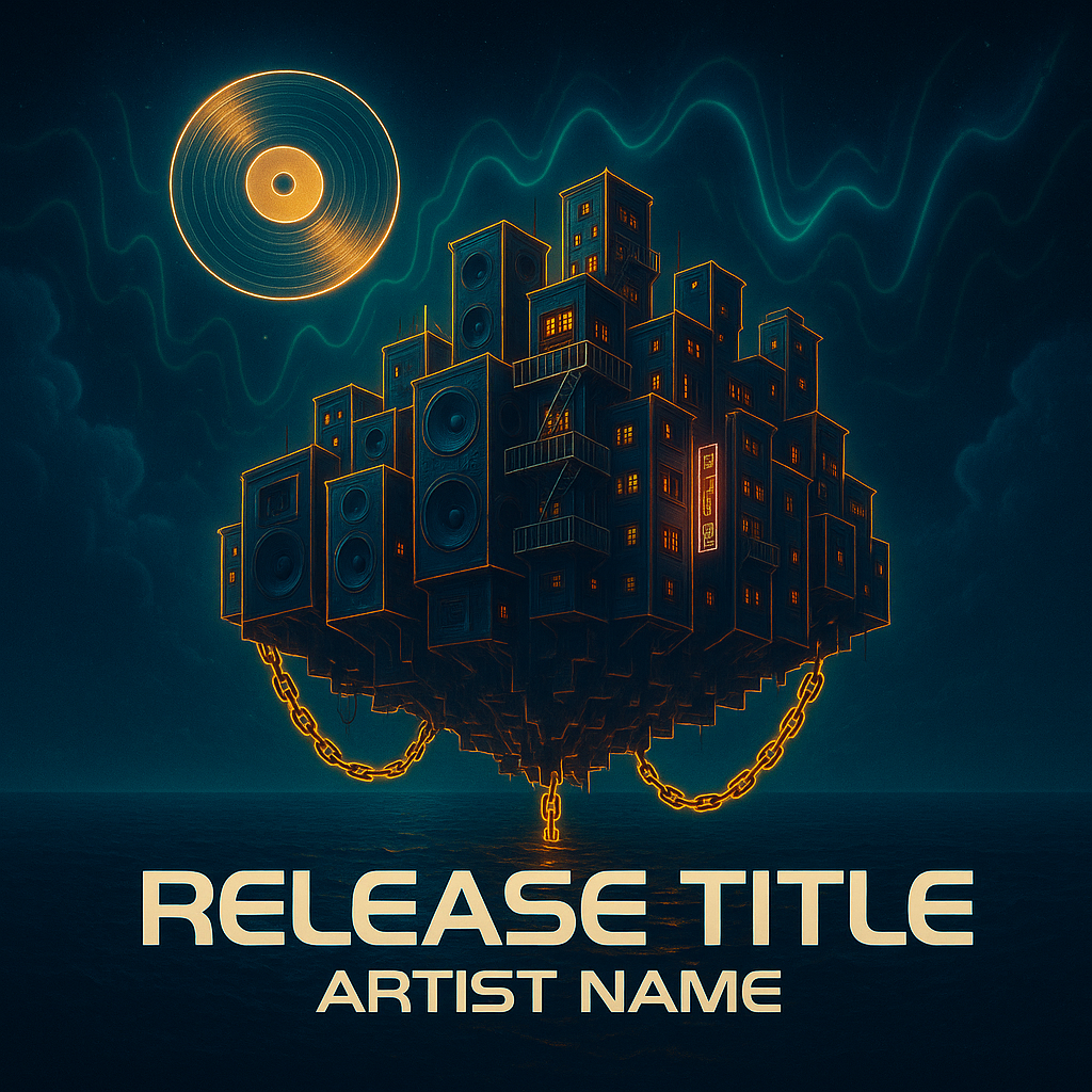 Design 1:1 album cover art for "Release Title" by "Artist Name". The scene shows a floating city built from broken speakers, neon-lit buildings, and fire escapes, all suspended by chains over a dark ocean. A glowing vinyl moon lights the sky while colorful soundwaves ripple across it like aurora borealis. Use Eurostile Extended or Orbitron for the font to give it a futuristic, sci-fi vibe. For an extra cinematic touch, add glowing outlines around the buildings and chains to enhance depth and lightplay.