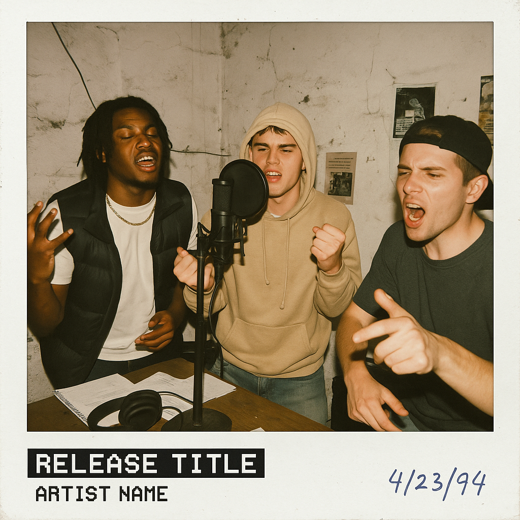 Design 1:1 album cover art for "Release Title" by "Artist Name" that is Polaroid-style and captures three friends in a gritty studio, mid-freestyle, lit by harsh direct flash. The walls are cracked, there are posters, wires, headphones, and notebooks everywhere. The photo looks overexposed and candid. Use Impact Label or OCR-A Std to match the vintage analog feel. Add a timestamp or handwriting on the Polaroid frame for authenticity.