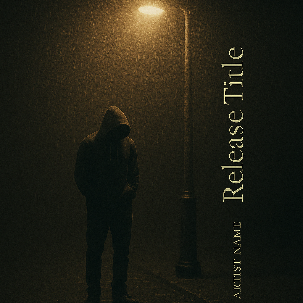 Design 1:1 album cover art for "Release Title" by "Artist Name" showing a figure in a hoodie standing under a flickering streetlight in the rain. Reflections pool on the sidewalk, and the background fades into shadows. Typography should be subtle and poetic—use Cormorant Garamond or Canela for an emotional tone. Lay the text vertically along the side of the pole or lamplight to mirror the rainfall.