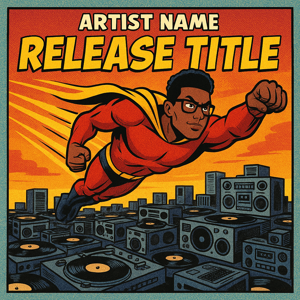 Design 1:1 album cover art for "Release Title" by "Artist Name" that is comic book-style, featuring an artist as a superhero flying over a city made of vinyl records, turntables, and boom boxes. Bright speed trails follow them across a sunset sky. Use Bangers or Comic Neue to match the comic book aesthetic. Apply halftone textures and comic panel-style framing to make it pop like vintage comic book art.