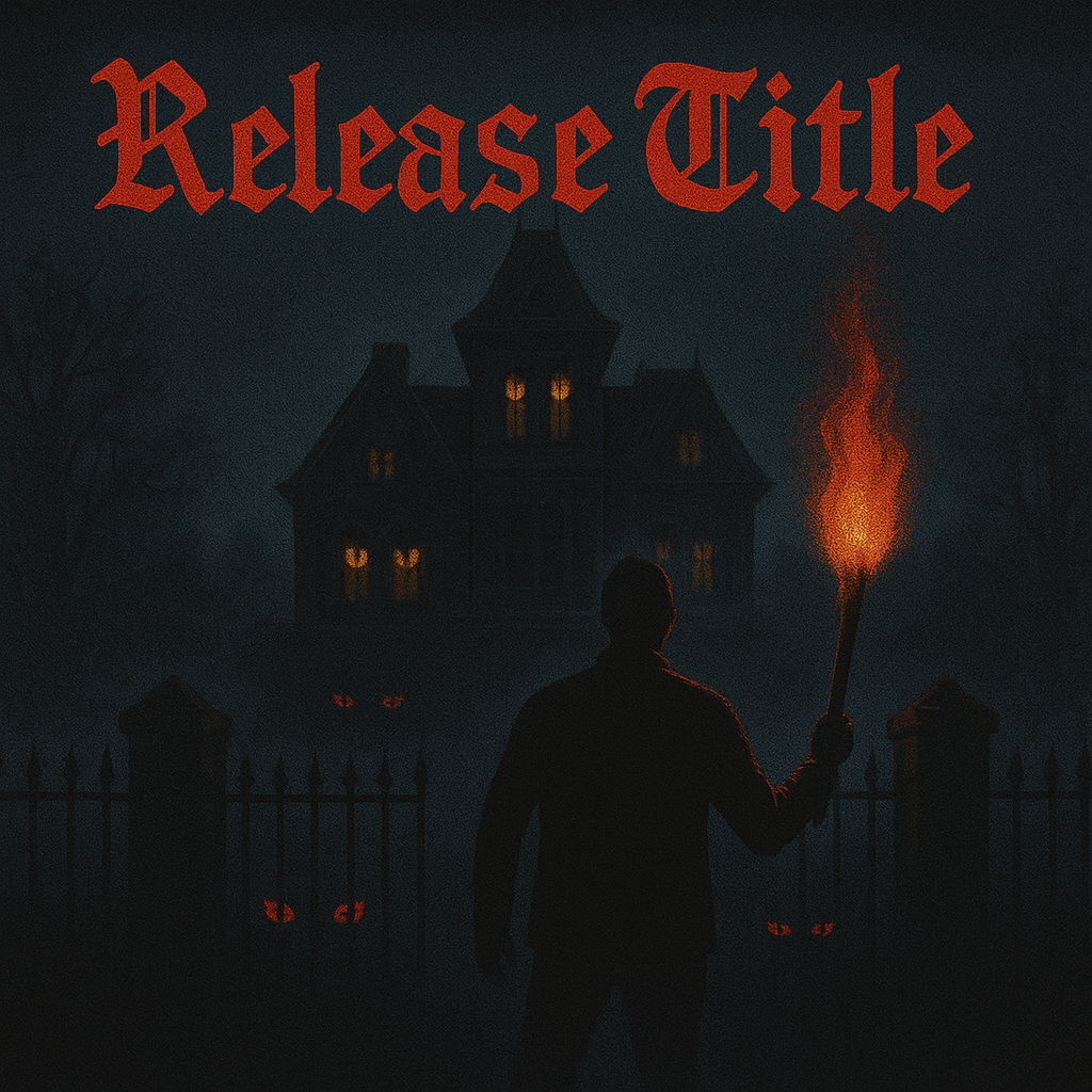 Design 1:1 album cover art for "Release Title" by "Artist Name" with a dark, horror-inspired cover. A haunted mansion looms behind a foggy gate with glowing eyes in the windows. The artist’s silhouette approaches holding a torch. Use Blackletter (e.g., UnifrakturCook) for the title to channel classic horror vibes.