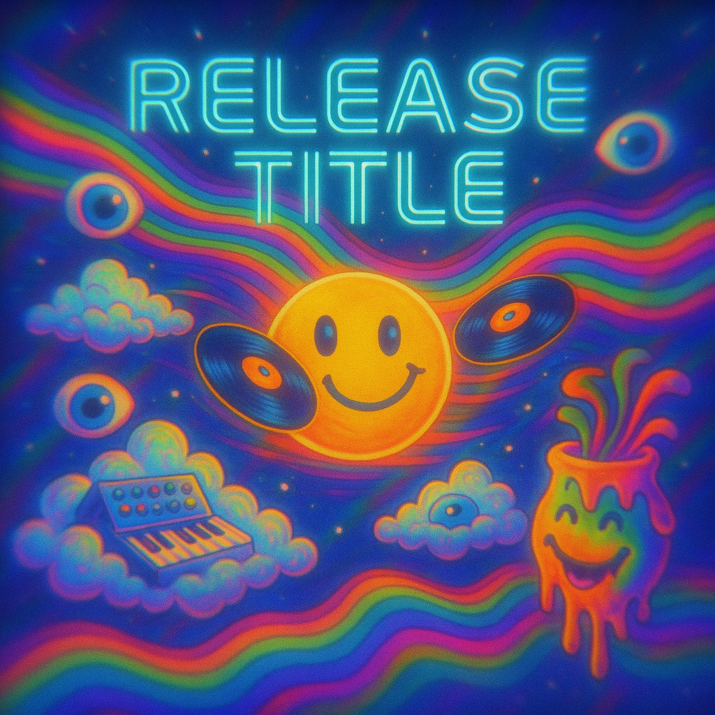 Design 1:1 album cover art for "Release Title" with a psychedelic, space-theme. Vinyl records orbit a glowing planet while rainbow-colored soundwaves ripple across the sky. Floating eyes, clouds made of synths, and melting faces complete the vibe. Use Monoton or Neon Tubes for glowing, futuristic type. Blur parts of the scene with a lens or prism effect to simulate motion or hallucination.