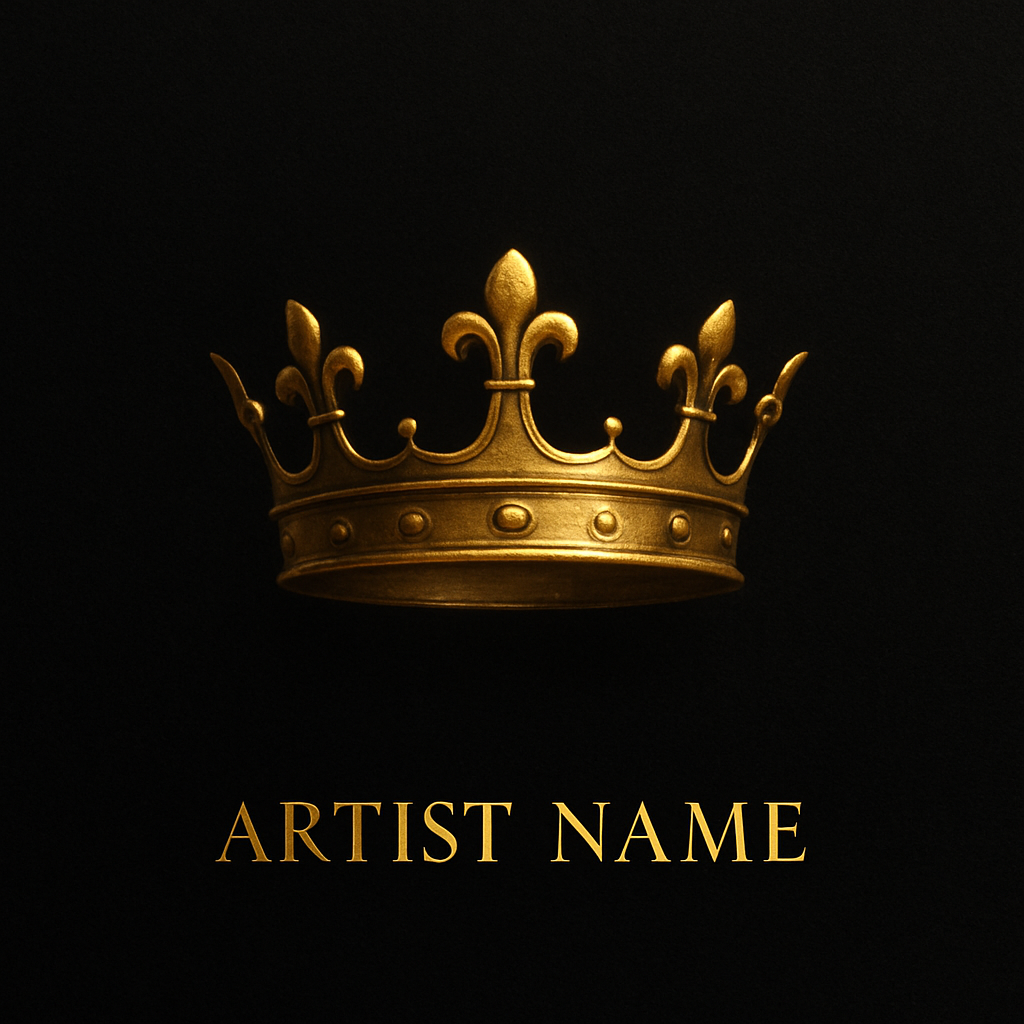 Design 1:1 album cover art that is minimalist. On a black background sits a detailed photorealistic gold crown, glowing slightly under soft light. No people—just a vibe of power and elegance. Only include the name of the artist- "Artist Name" in small letters below. Use Didot or Trajan Pro for a refined, regal feel. Emboss the artist name in gold foil with a subtle velvet texture on the background.